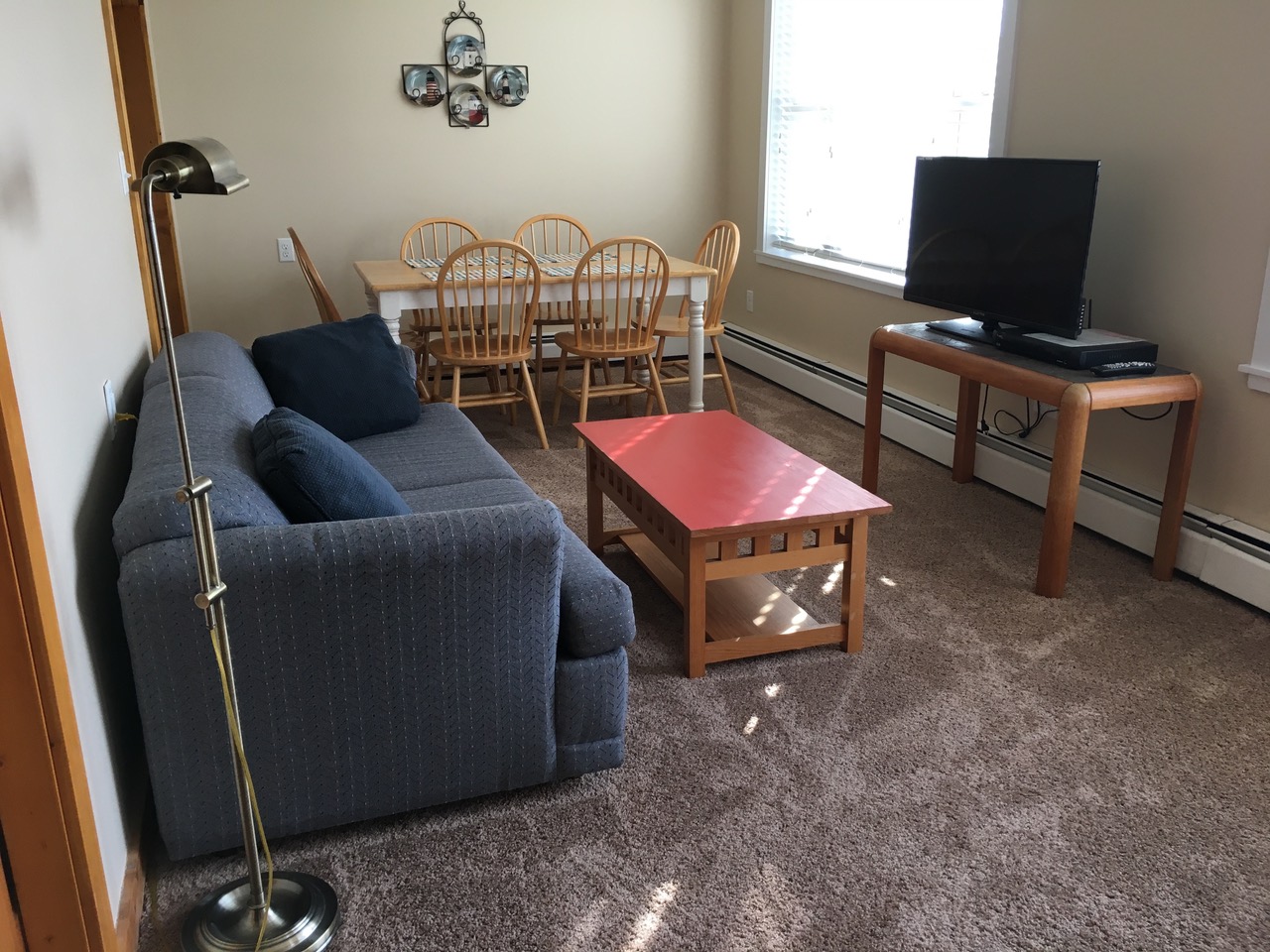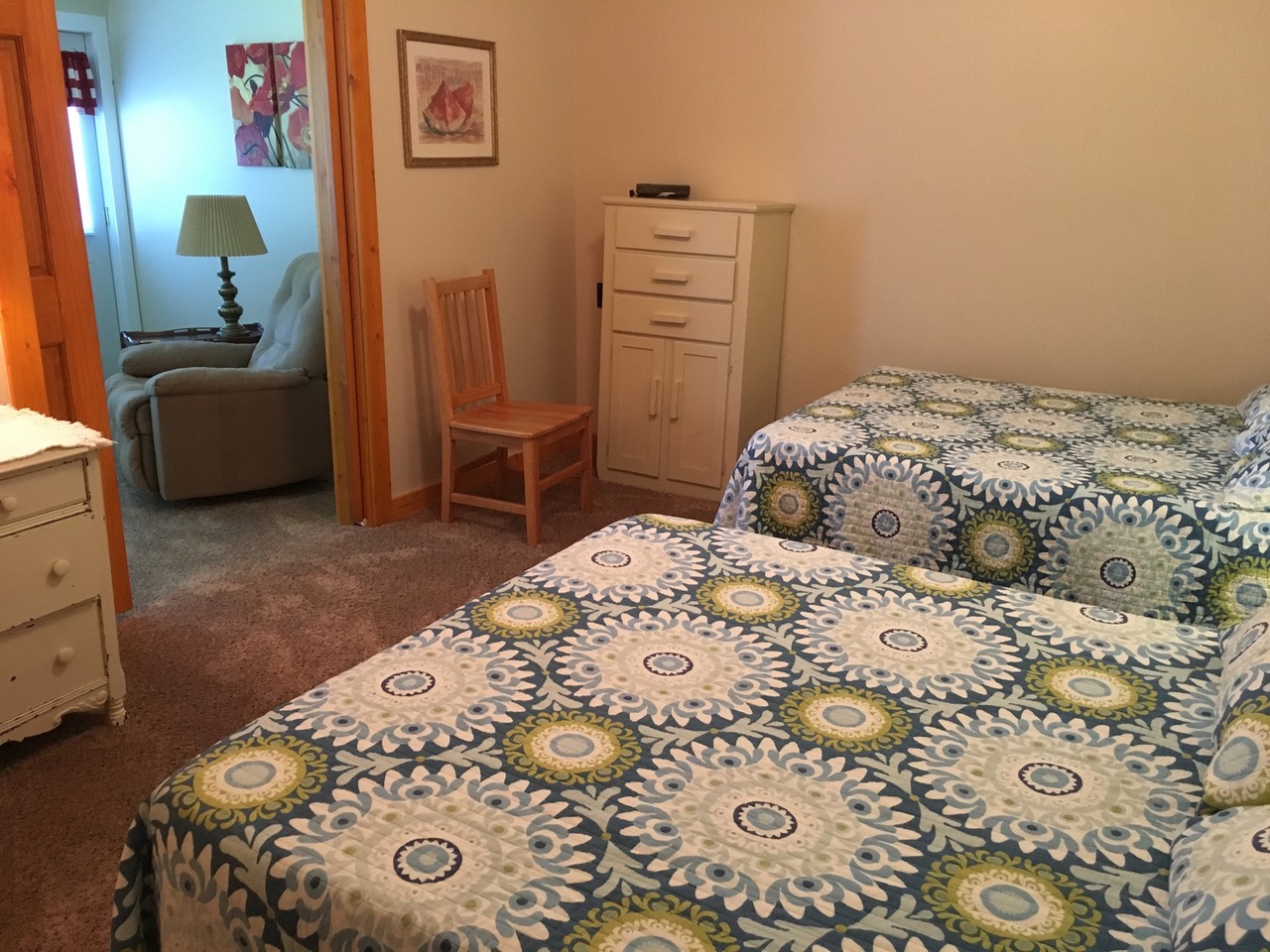 This Unit features water views from the living room, sleeper sofa, 32" flatscreen TV with built in DVD player. There is a double bed in the first bedroom, and two double beds in the second bedroom. The bathroom with shower is located off the master bedroom. This Unit is connected to Unit 3 if rented together with Unit 3.