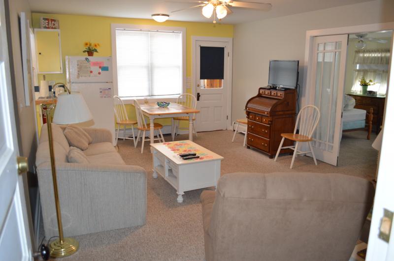 This Unit features a large living room with a sleeper sofa, 32" flatscreen TV with built in DVD player. There is a king size bed in the first bedroom, and a queen bed in the second bedroom. The bathroom is located off the living room. This Unit has access to Units 1 and 2 when rented together.